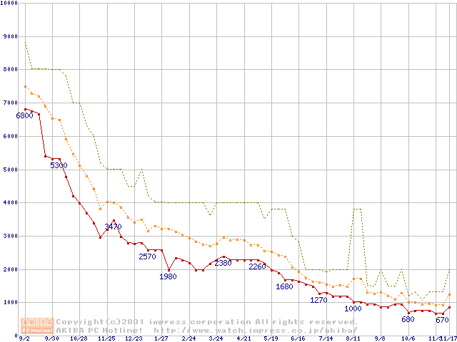 PC100 SDRAM DIMM CasLatency=2の最安値推移