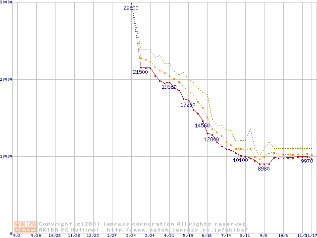 Socket A (Thunderbird,PGA,FSB 266MHz,L2 256KB)の最安値推移