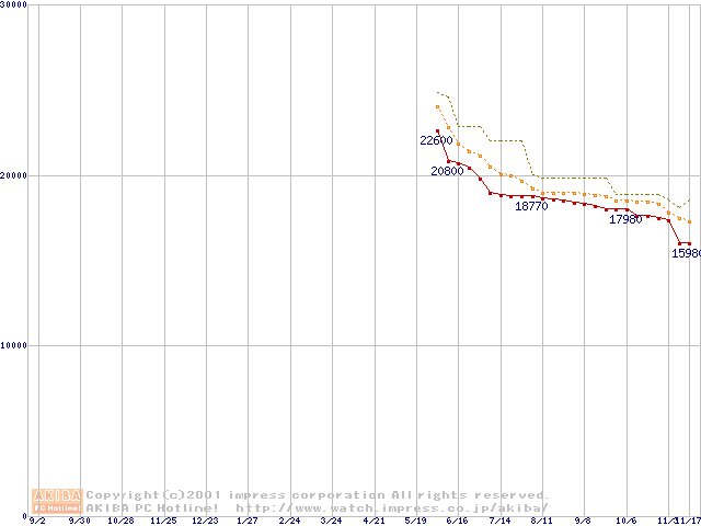 HDD主要製品(最安値1万5千円~2万円未満)の最安値推移