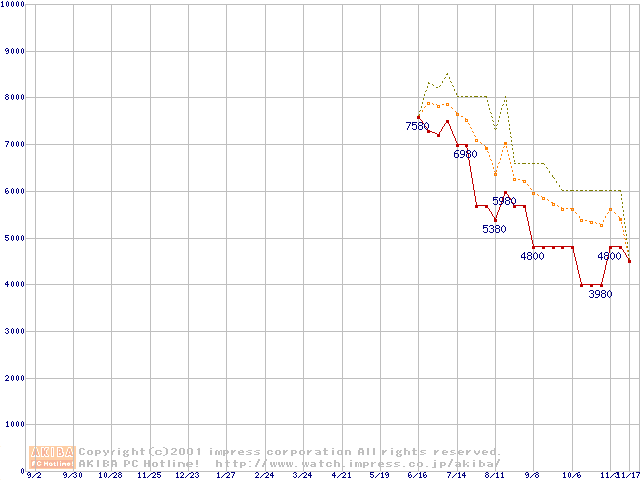 Socket 370 (PGA,FSB 100MHz,L2 64KB)の最安値推移