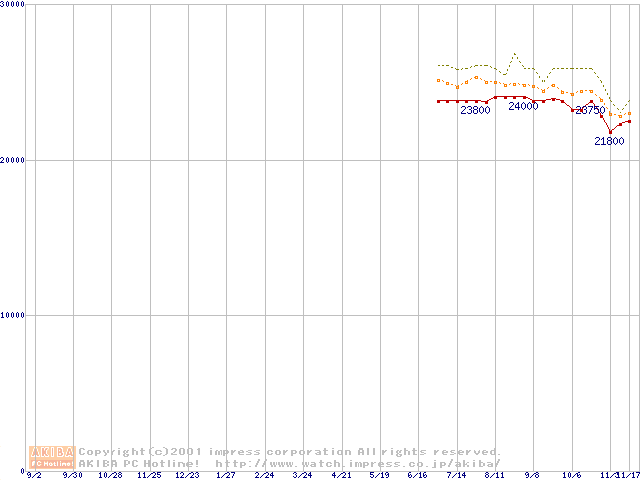 Socket 370 (FC-PGA2,FSB 133MHz,L2 256KB)の最安値推移