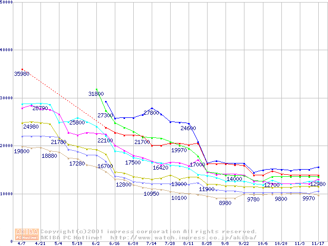 | [↑前グラフ]: | Socket A (Palomino,PGA,FSB 266MHz,L2 256KB)の最安値推移 |