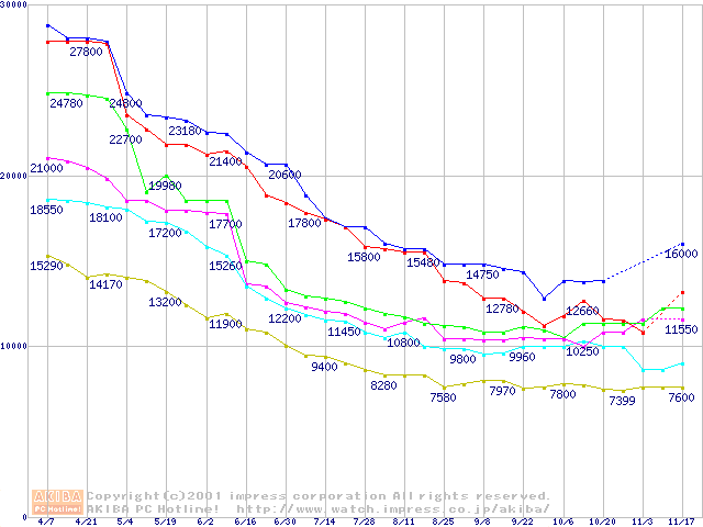 | [↑前グラフ]: | Socket A (Thunderbird,PGA,FSB 266MHz,L2 256KB)の最安値推移 |