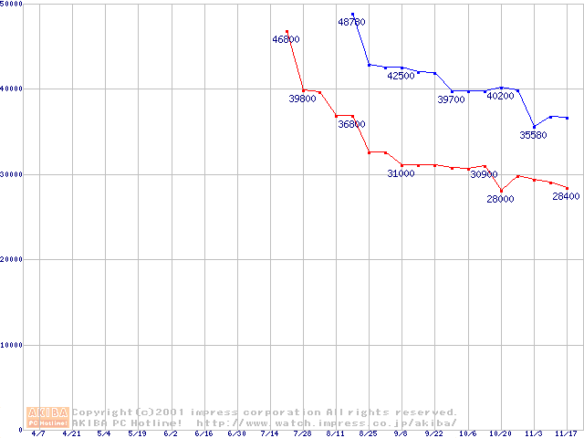 | Socket 370 (FC-PGA2,FSB 133MHz,L2 512KB)の最安値推移(テスト公開中) |