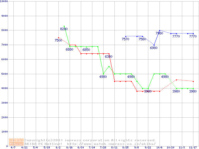 | [↓次グラフ]: | DiamondMax Plus D740X (7200rpm,UltraATA/133,40GB/Platter)の最安値推移 |