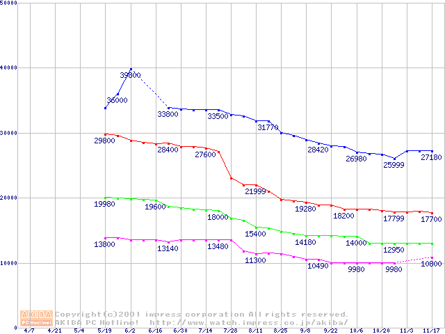 | [↑前グラフ]: | DiamondMax D540X (5400rpm UltraATA/100 40GB/Platter)の最安値推移 |