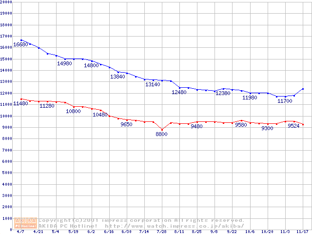 | [↓次グラフ]: | U6 (5400rpm UltraATA/100 2MB 40GB/Platter)の最安値推移 |