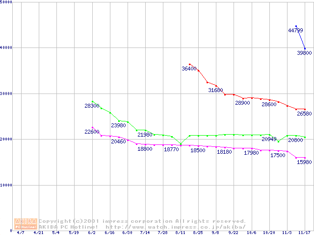 | [↑前グラフ]: | Deskstar 60GXP (7200rpm UltraATA/100 2MB)の最安値推移 |