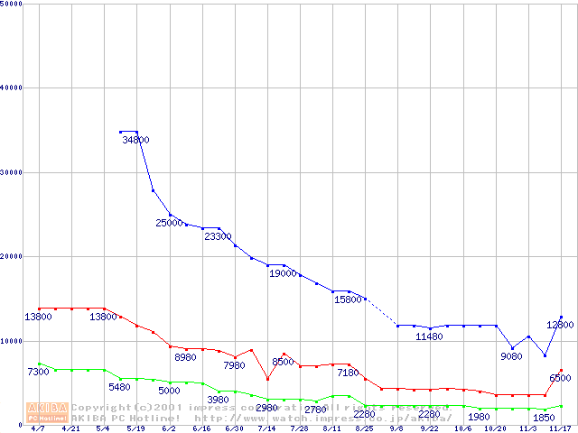 | [↑前グラフ]: | PC100 SDRAM DIMM CasLatency=2の最安値推移 |