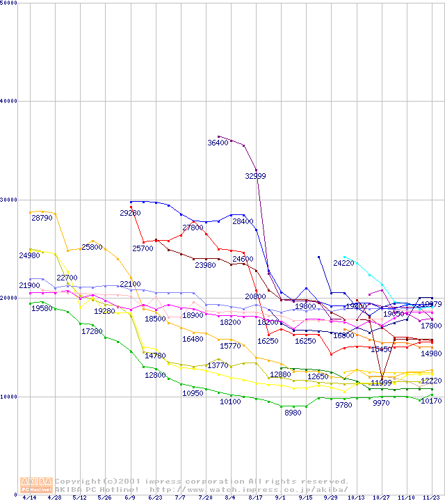 CPU主要製品(最安値2万円~3万円未満)の最安値推移