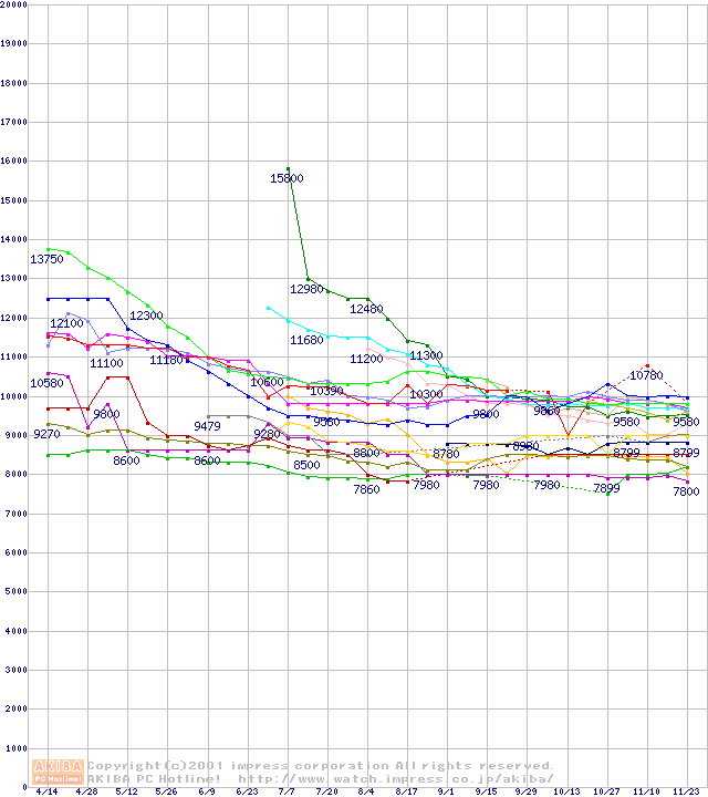 HDD主要製品(最安値1万円~1万5千円未満)の最安値推移