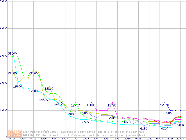 メモリ主要製品(最安値1万円以上)の最安値推移
