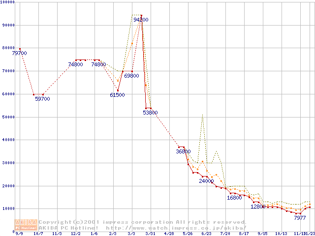 PC133 SDRAM DIMM CasLatency=3 ECC対応の最安値推移