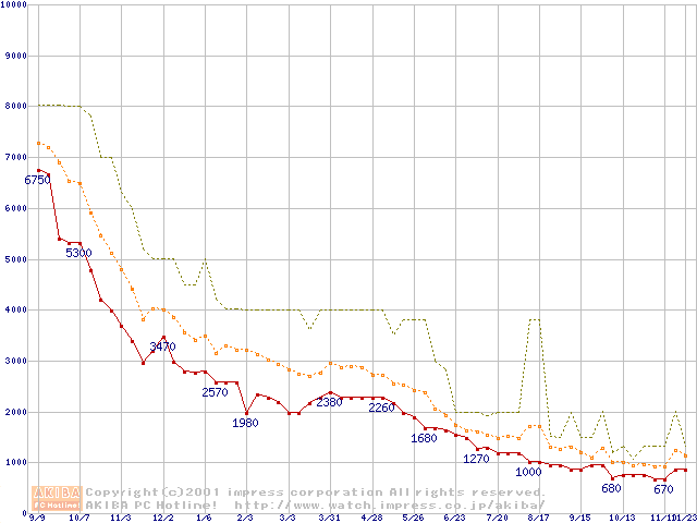 PC100 SDRAM DIMM CasLatency=2の最安値推移