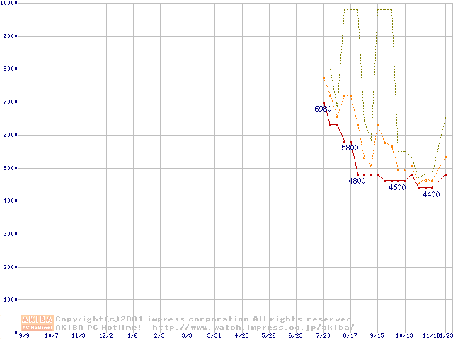 PC100 SDRAM DIMM CasLatency=2 ECC対応 Registeredタイプの最安値推移