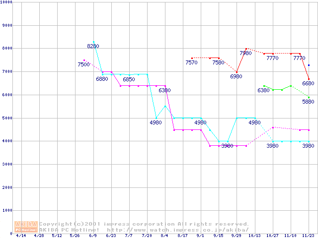 | [↓次グラフ]: | DiamondMax Plus D740X (7200rpm,UltraATA/133,40GB/Platter)の最安値推移 |