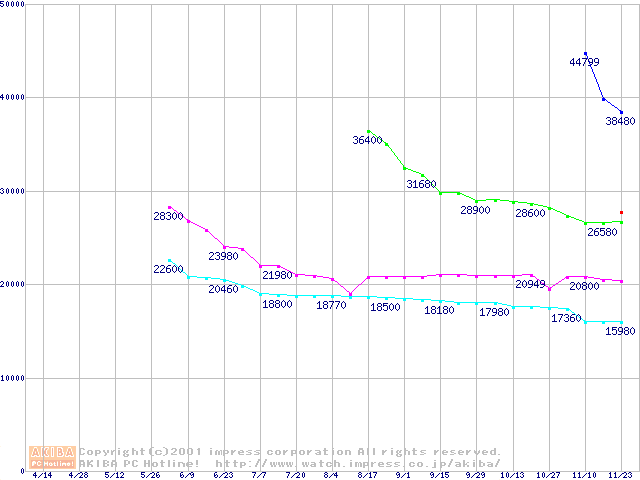 | [↑前グラフ]: | Deskstar 40GV (5400rpm UltraATA/100)の最安値推移 |