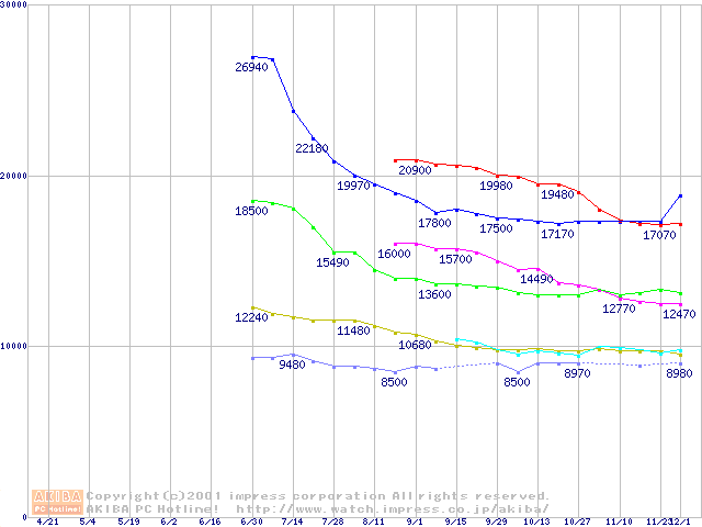 | [↓次グラフ]: | DiamondMax 536DX (5400rpm,UltraATA/100,33.3GB/Platter)の最安値推移 |