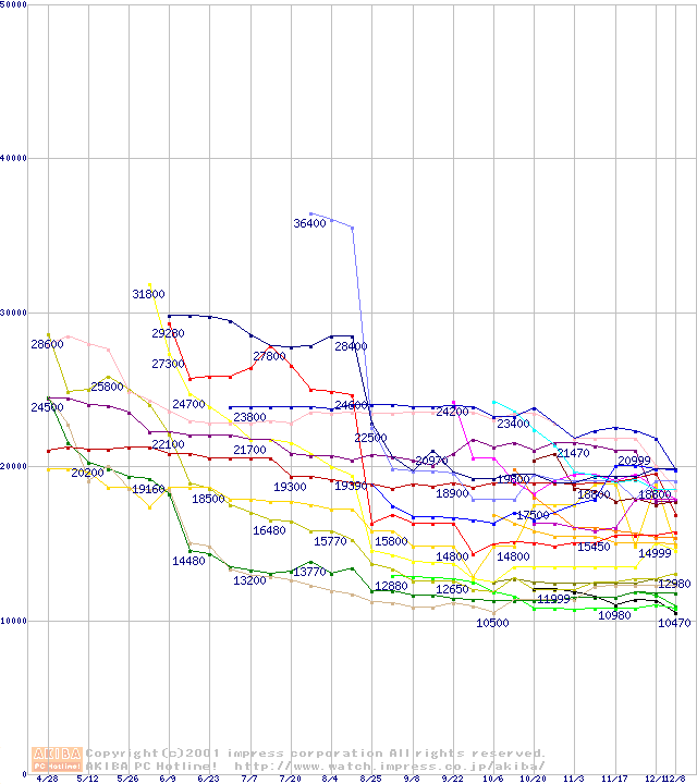 CPU主要製品(最安値1万円~2万円未満)の最安値推移