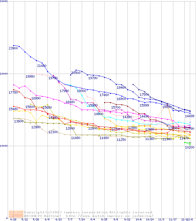 HDD主要製品(最安値1万円~1万5千円未満)の最安値推移