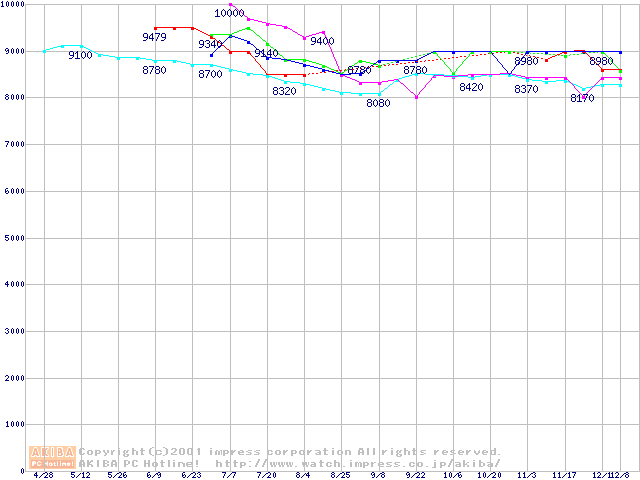 | [↑前グラフ]: | HDD 10GB~20GB未満(5400rpmクラス)の最安値推移 |