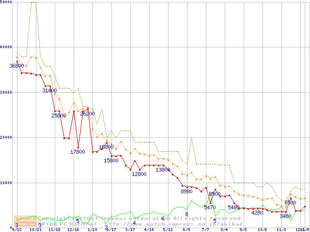 PC100 SDRAM DIMM CasLatency=2 ECC対応の最安値推移