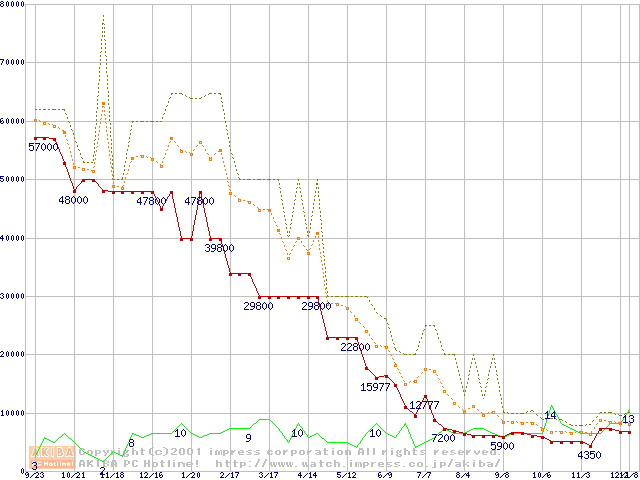PC100 SDRAM DIMM CasLatency=2の最安値推移