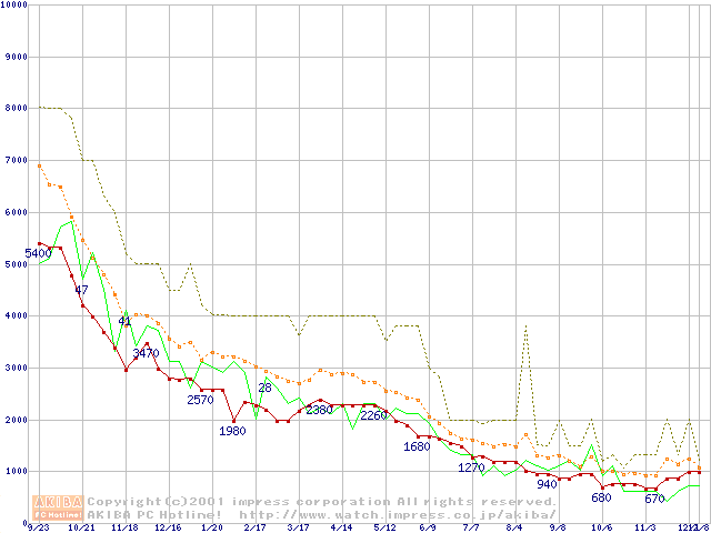 PC100 SDRAM DIMM CasLatency=2の最安値推移