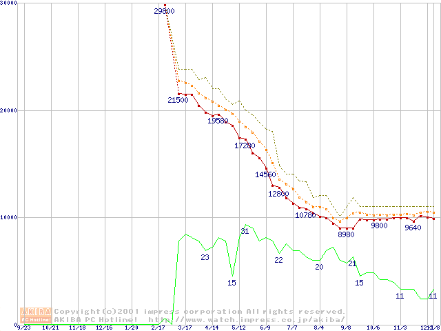 Socket A (Thunderbird,PGA,FSB 266MHz,L2 256KB)の最安値推移