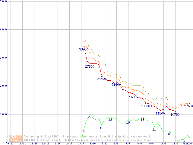 Socket A (Thunderbird,PGA,FSB 200MHz,L2 256KB)の最安値推移