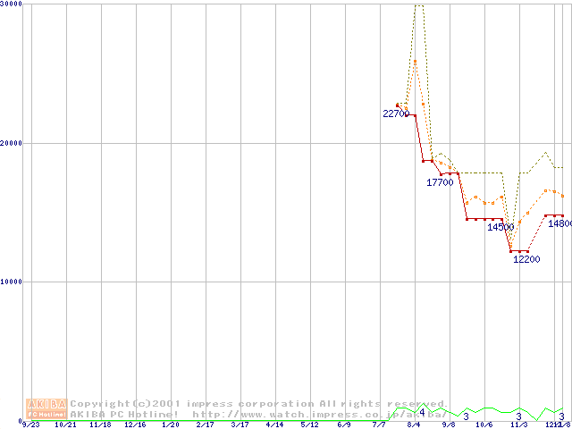 PC100 SDRAM DIMM CasLatency=2 ECC対応 Registeredタイプの最安値推移