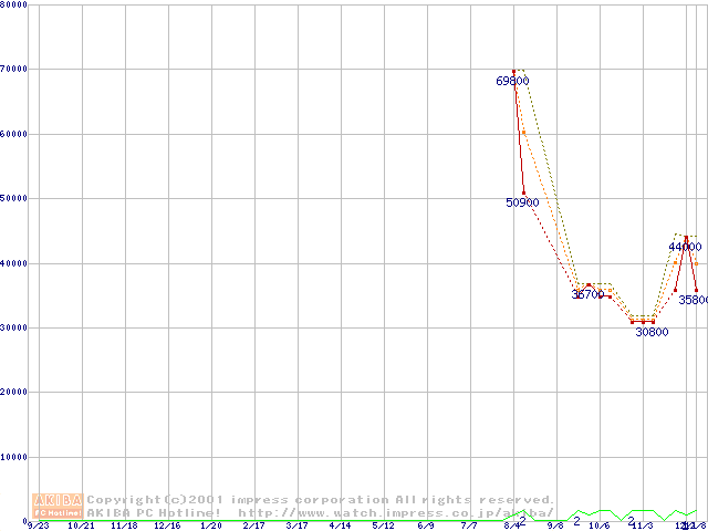 PC100 SDRAM DIMM CasLatency=2 ECC対応 Registeredタイプの最安値推移