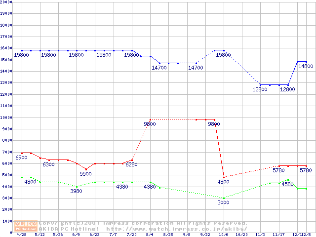| [↑前グラフ]: | Socket A (Spitfire,PGA,FSB 200MHz,L2 64KB,1.4V)の最安値推移 |