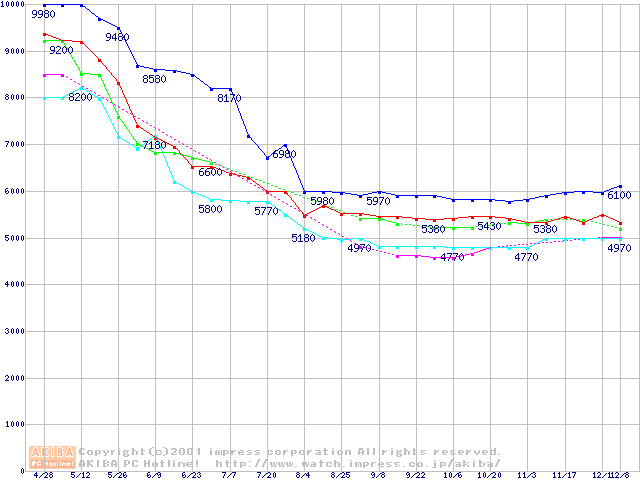 | [↑前グラフ]: | Socket 370 (FC-PGA,FSB 100MHz,L2 128KB)の最安値推移 |