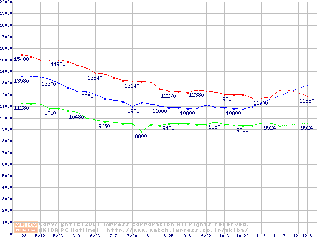 | [↑前グラフ]: | Barracuda ATA IV (7200rpm,UltraATA/100 2MB 40GB/Platter)の最安値推移 |