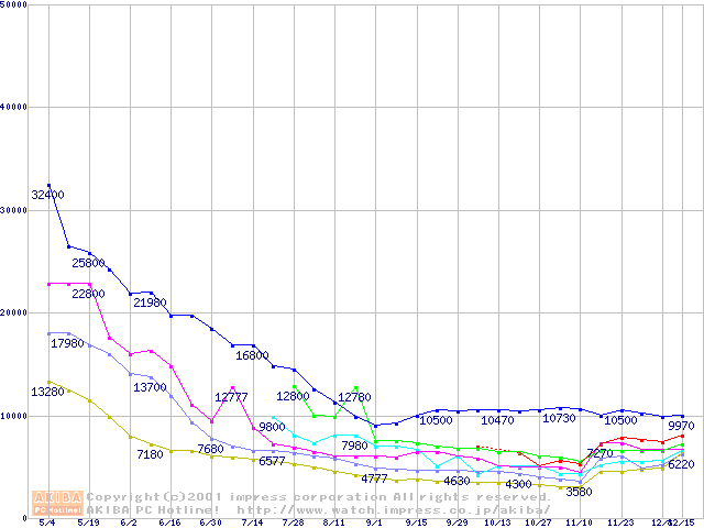 メモリ主要製品(最安値1万円以上)の最安値推移