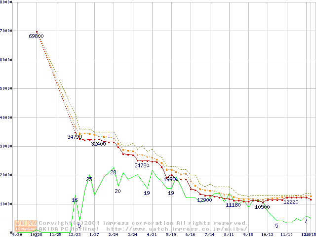 Socket A (Thunderbird,PGA,FSB 200MHz,L2 256KB)の最安値推移