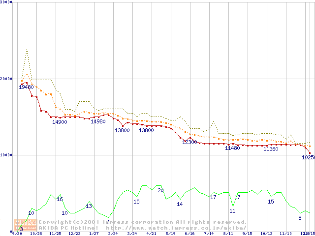 WD Caviar (7200rpm,UltraATA/100,20GB/Platter)の最安値推移