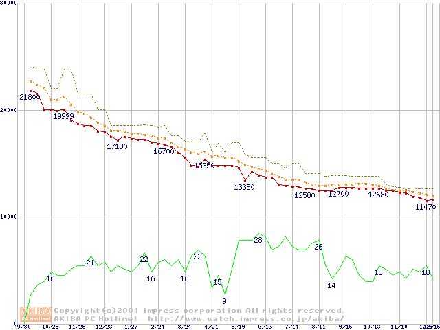 WD Caviar (7200rpm,UltraATA/100,20GB/Platter)の最安値推移