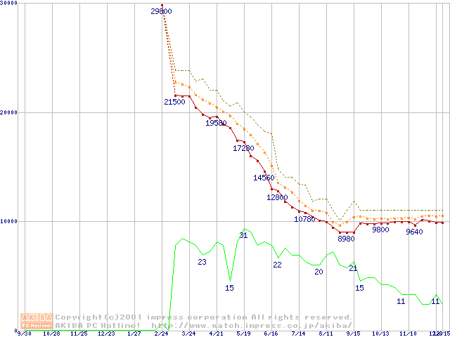 Socket A (Thunderbird,PGA,FSB 266MHz,L2 256KB)の最安値推移