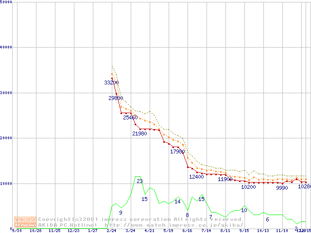 Socket A (Thunderbird,PGA,FSB 266MHz,L2 256KB)の最安値推移