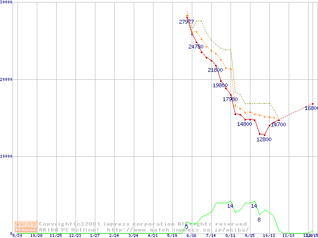 Socket A (Thunderbird,PGA,FSB 200MHz,L2 256KB)の最安値推移