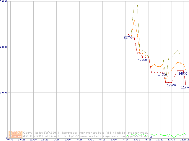 PC100 SDRAM DIMM CasLatency=2 ECC対応 Registeredタイプの最安値推移