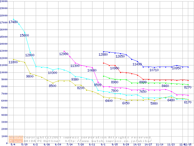 | [↑前グラフ]: | Socket 370 (FC-PGA2,FSB 100MHz,L2 256KB)の最安値推移 |
