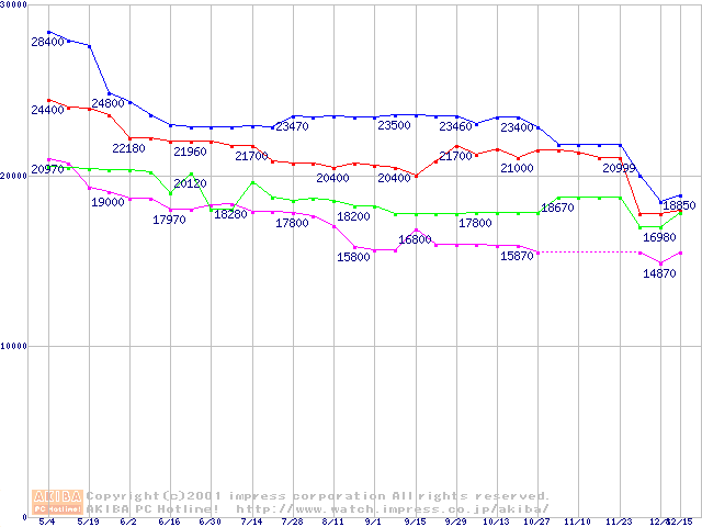 | [↑前グラフ]: | Socket 370 (FC-PGA2,FSB 133MHz,L2 256KB)の最安値推移 |