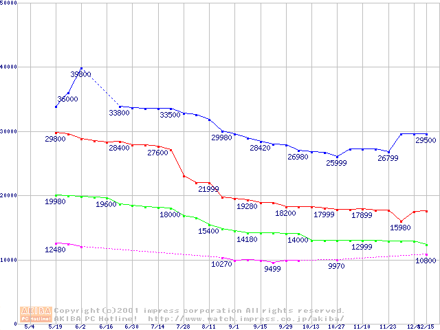 | [↑前グラフ]: | DiamondMax D540X (5400rpm,UltraATA/100,40GB/Platter)の最安値推移 |