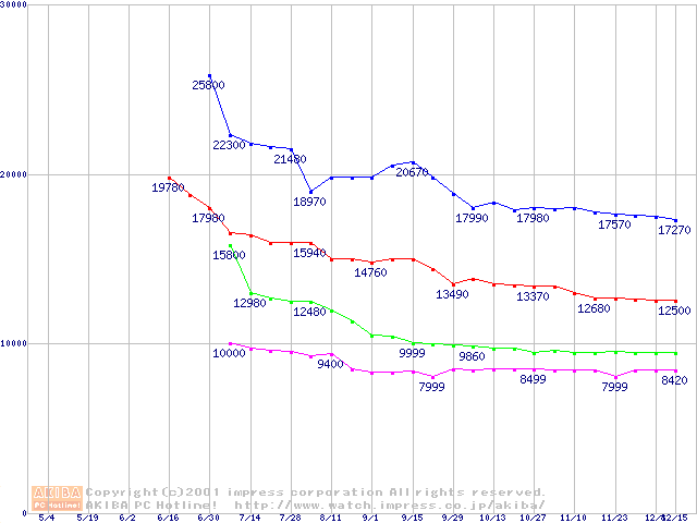 | [↓次グラフ]: | Deskstar 60GXP (7200rpm,UltraATA/100 2MB)の最安値推移 |