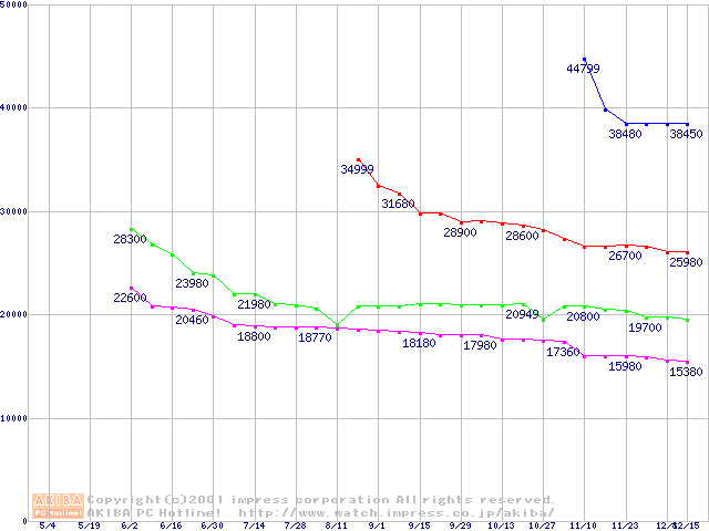 | [↓次グラフ]: | WD Caviar (7200rpm,UltraATA/100,20GB/Platter)の最安値推移 |