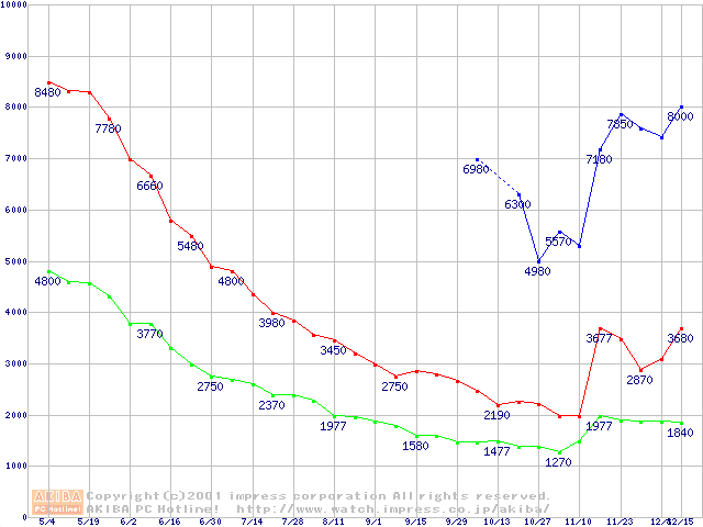 | [↓次グラフ]: | PC100 SDRAM DIMM CasLatency=2の最安値推移 |