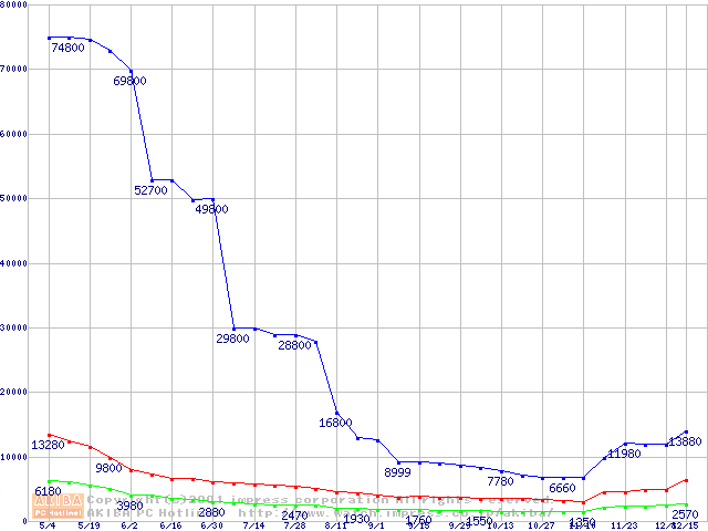| [↑前グラフ]: | PC100 SDRAM DIMM CasLatency=2 ECC対応 Registeredタイプの最安値推移 |